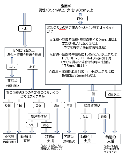 40歳~74歳の加入者の特定健康診査(定期健康診断・人間ドック等を含む)結果から、腹囲等の数値と血糖、脂質、血圧の数値が一定以上となる項目等(リスク)の数の組み合わせによって、特定保健指導の対象者を下記の基準により判定します。